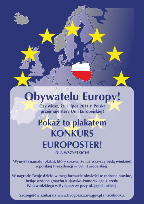 Adresatami konkursu są wszyscy mieszkańcy regionu, którzy w ciekawy i inspirujący sposób wypromują polskie przewodnictwo w Radzie UE. Projekty powinny posiadać format A3 bądź większy, być nieoprawione i wykonane w dowolnej technice plastycznej. Wybrane prace zostaną wykorzystane w kampaniach promocyjno-informacyjnych, natomiast zwycięski plakat stanie się wizytówką i ozdobą gmachu Kujawsko-Pomorskiego Urzędu Wojewódzkiego. Ponadto, 1 lipca zaprezentowana zostanie wystawa złożona z najciekawszych projektów.