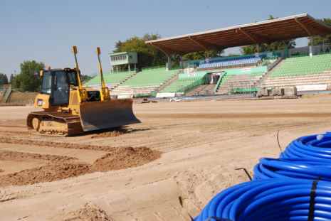 Wykonano już m.in. drenaż płyty i cześć warstwy odsączającej wraz z przeciskiem pod bieżnią i sterownią ogrzewania. Pod trawnikiem „z rolki” powstanie również instalacja nawadniająca i grzewcza przykryta warstwą gleby.