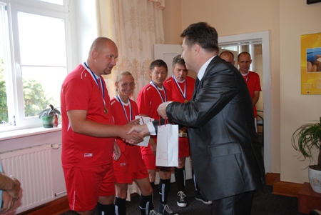 A pomniejsz czcionkę A standardowy rozmiar A powiększ czcionkęPiłkarze z grudziądzkiego Domu Pomocy Społecznej nr 1, którzy wygrali Międzynarodową Ligię Piłki Nożnej Osób Niepełnosprawnych SENI Cup 2011 w Toruniu spotkali się z wiceprezydentem Przemysławem Ślusarskim w Ratuszu.