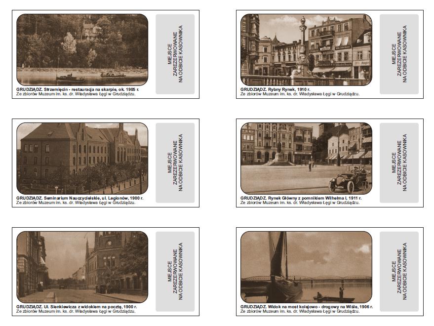 Na rewersach biletów jednorazowych umieszczone zostały fotografie przedstawiające restaurację na skarpie na Strzemięcinie z ok. 1905 r., Rybny Rynek z 1910 r., Seminarium Nauczycielskie przy ul. Legionów z 1900 r., Rynek Główny z pomnikiem Wilhelma I z 1911 r., ul. Sienkiewicza z widokiem na pocztę z 1900 r. oraz widok na most kolejowo-drogowy na Wiśle z 1906 r.