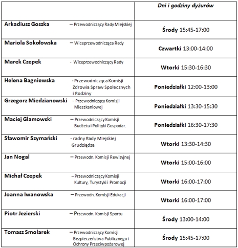 Arkadiusz Goszka, Przewodniczący Rady Miejskiej oraz Mariola Sokołowska i Marek Czepek, Wiceprzewodniczący Rady Miejskiej będą przyjmować interesantów w pok. nr 212, natomiast pozostali rajcy w pok. nr 208, tel. 56 45 10 212.