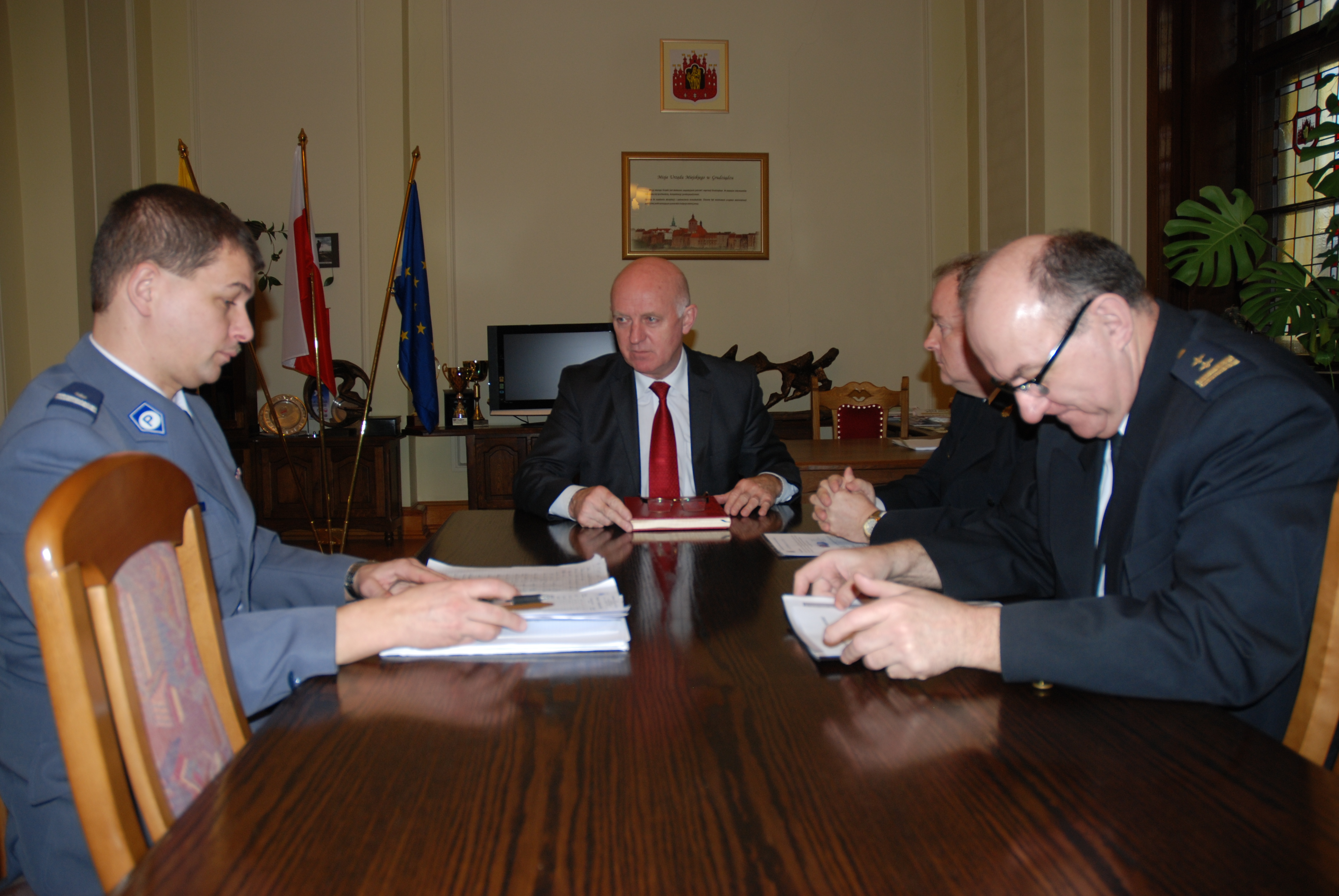A pomniejsz czcionkę A standardowy rozmiar A powiększ czcionkęPrezydent Grudziądza Robert Malinowski spotkał się dziś, tj. 19 stycznia z Mirosławem Elszkowskim, Komendantem Miejskim Policji, Janem Przeczewskim, Komendantem Straży Miejskiej i Konradem Przybylakiem, Komendantem Państwowej Straży Pożarnej, by podsumować 2010 r.