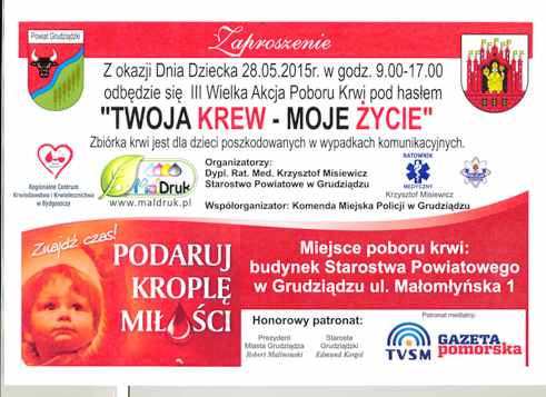 A pomniejsz czcionkę A standardowy rozmiar A powiększ czcionkęZachęcamy mieszkańców Grudziądza do udziału w III edycji zbiórki krwi pod hasłem „Twoja Krew - Moje Życie”. Akcja organizowana z okazji Dnia Dziecka wesprze najmłodszych poszkodowanych w wypadkach komunikacyjnych. Wydarzenie zaplanowano 28 maja w godz. 9.00-17.00.